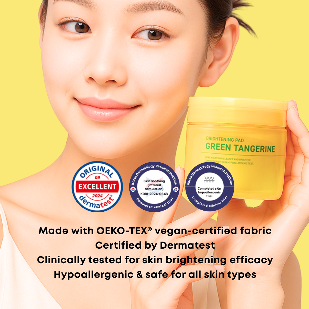 SOMISOME Green Tangerine Radiant Tone Up Pads are formulated with Jeju Green Tangerine Extract, Niacinamide, and Centella Asiatica. These pads help brighten dullness, refine uneven skin tone, and support a healthier complexion. Each pack includes 50 dual-sided pads made with premium cotton. The textured side gently exfoliates, and the soft side absorbs toner.