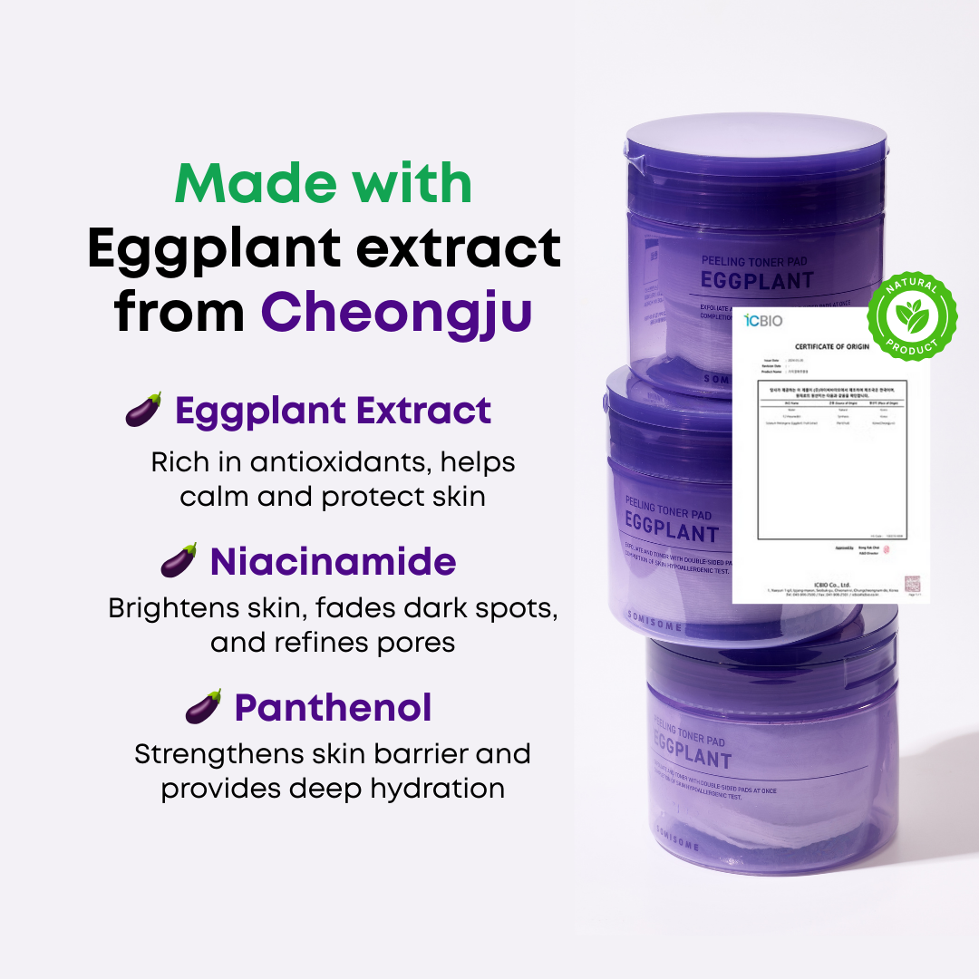 SOMISOME Eggplant Peeling Toner Pads gently lift away dead skin cells to smooth rough and dull texture while supporting pore care and clarity. Each pack includes 50 dual-texture cotton pads—one side with gauze for exfoliation, the other embossed for toning designed for effective yet low-irritation daily use.